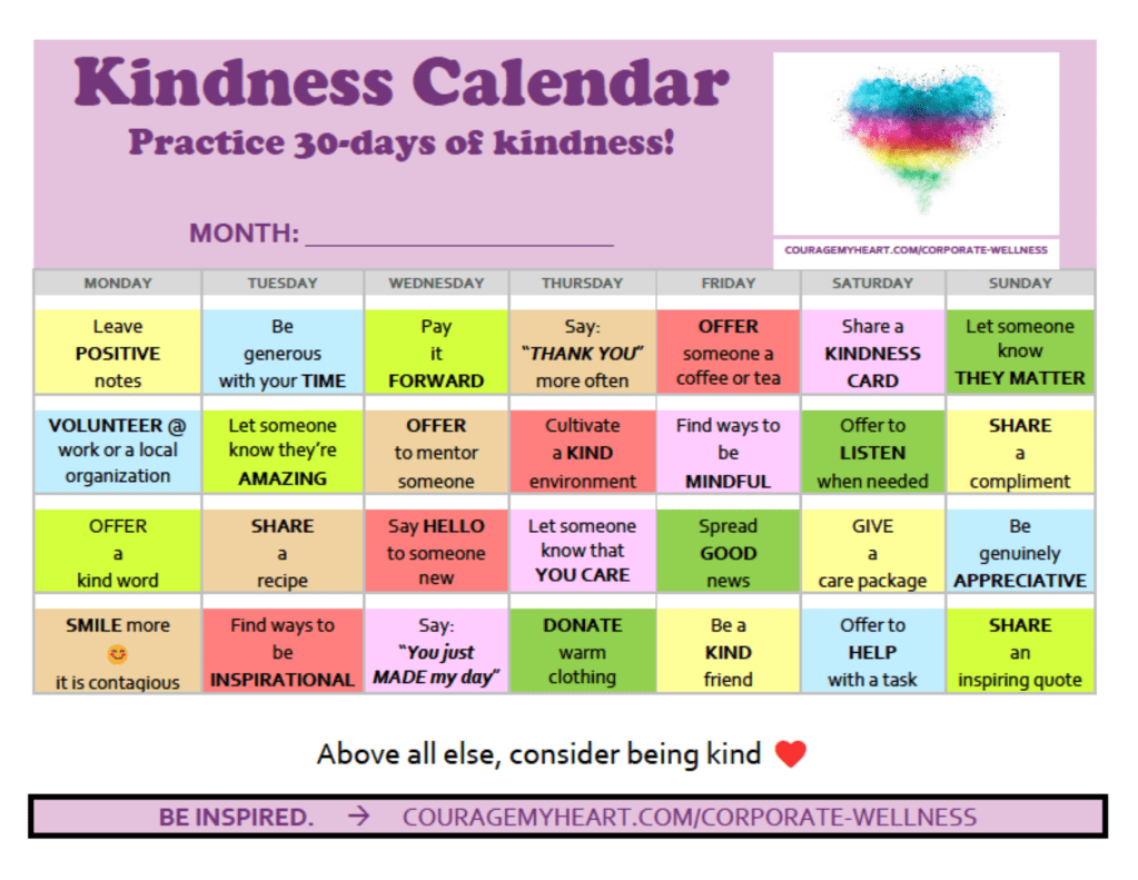 30-days of kindness with ideas, prompts and reminders!